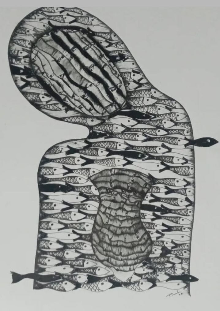Seus desenhos e gravura estão sempre articulando os mesmos símbolos: peixes, olhos, seios, cabeças cobertas por panos, corpos feito de folhas…as figuras evocam algo iniciático, misterioso, como se você desenhasse entidades de outra dimensão. O que essa simbologia representa para você?